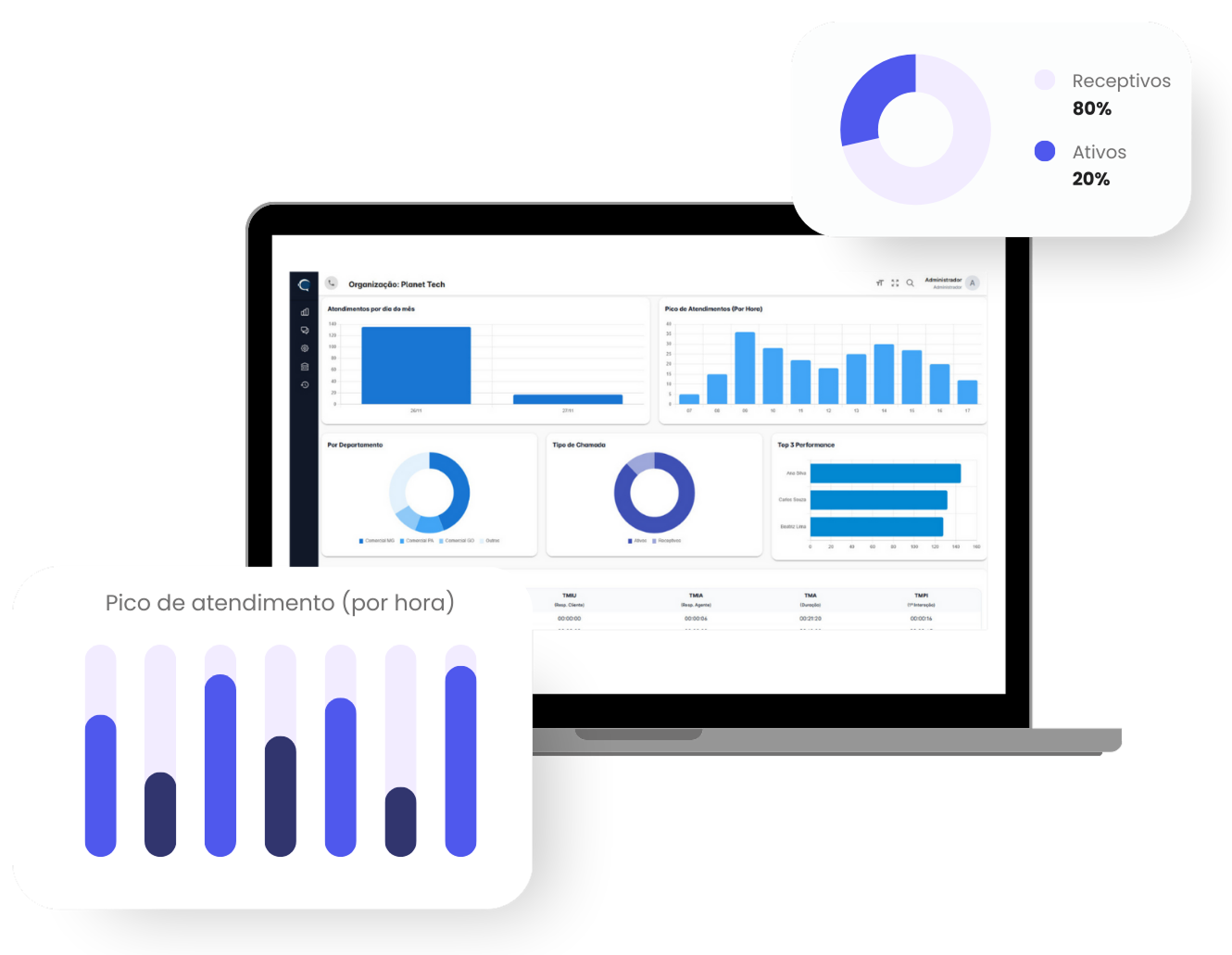 Visualize os números de telefone ativos, acompanhe atendimentos em tempo real e monitore a performance da equipe.